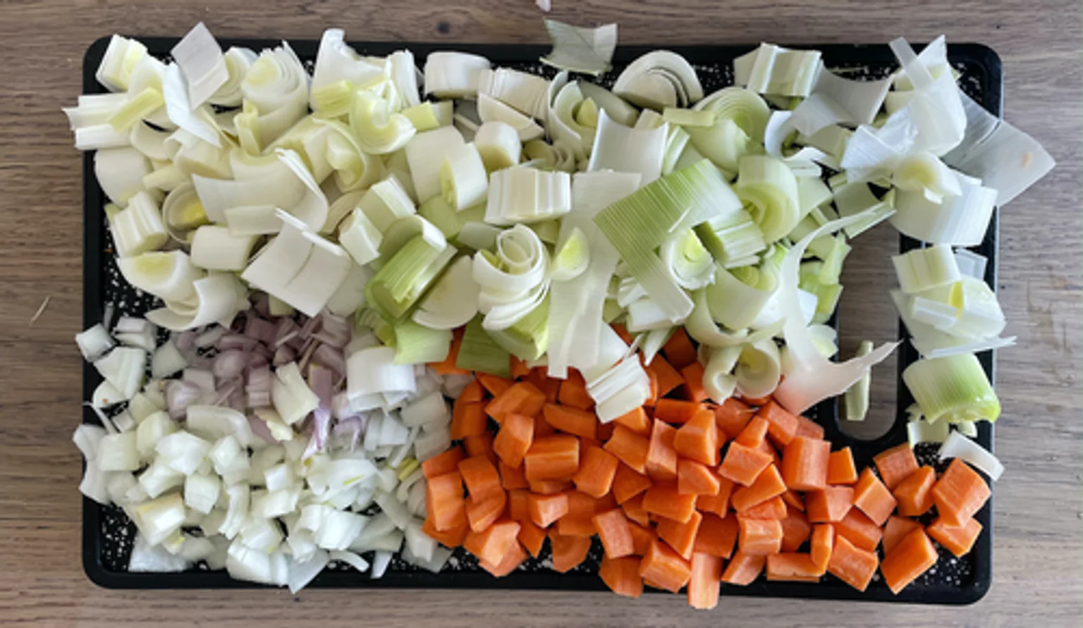 Éplucher et couper en morceaux les carottes, les poireaux, les oignons et les échalotes.
