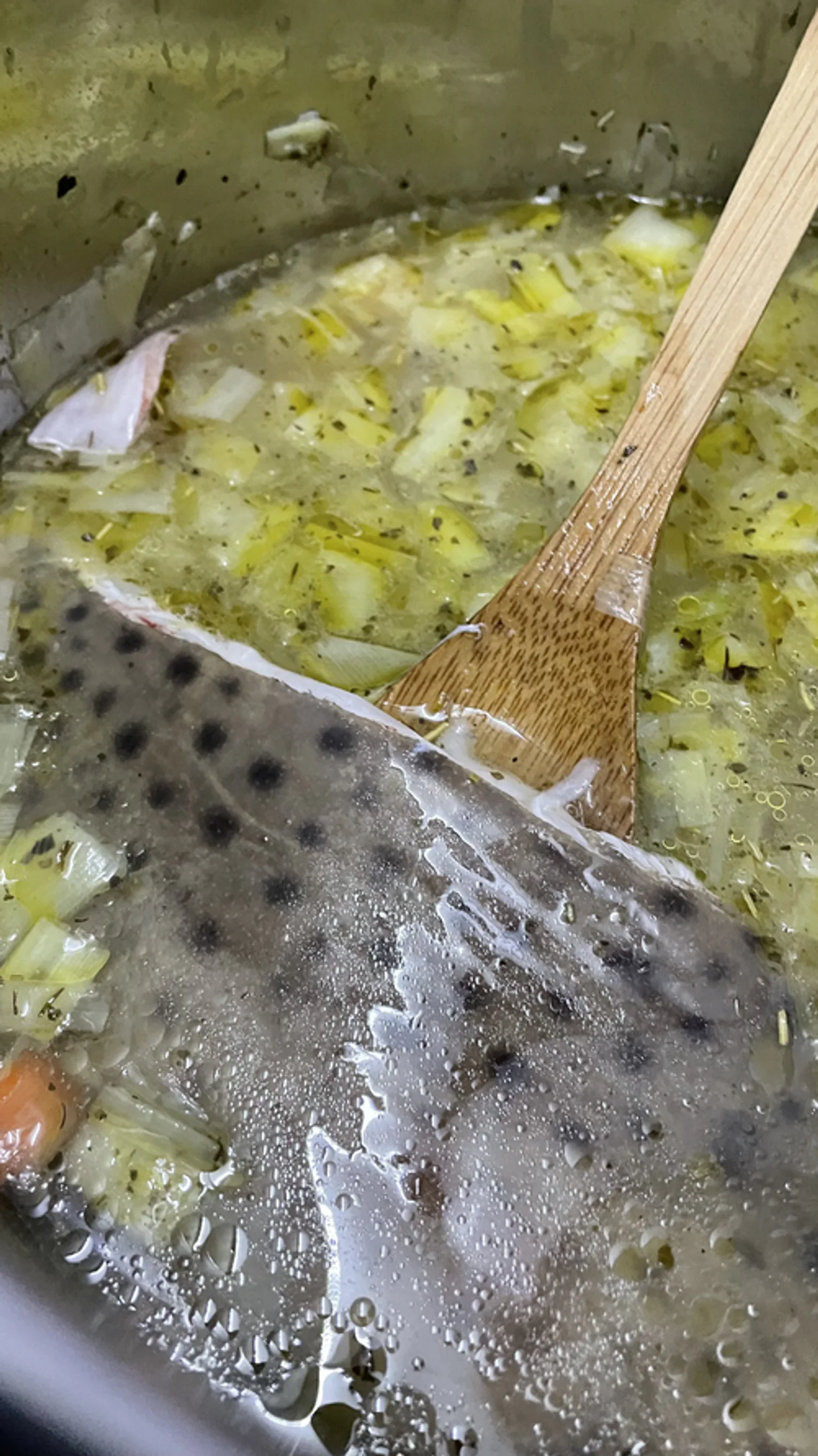 - Dès que les légumes sont dorés et mi-cuits, ajouter 2 L d’eau froide et l’aile de raie (départ eau froide).